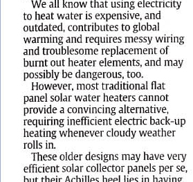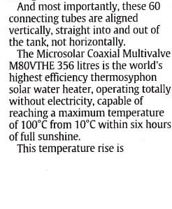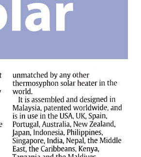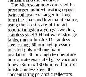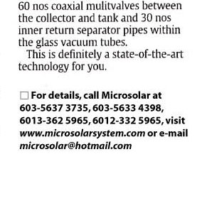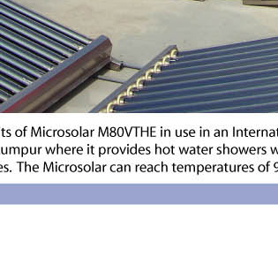 eliminating the electricity bills. The Malaysian designed Microsolar water heater, the world’s highest efficiency solar heater, has amazed users with its high temperatures even under wet, windy and overcast monsoon conditions. where previously other solar water heaters could not deliver.
